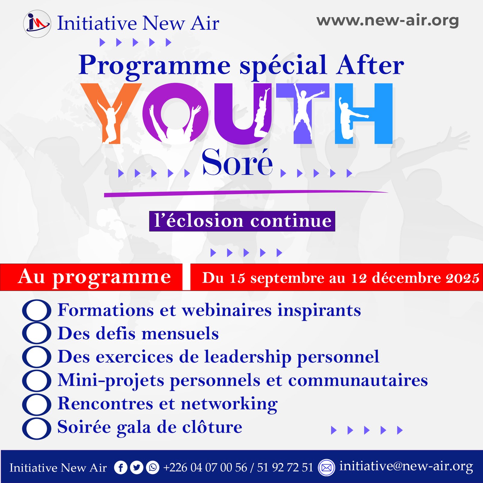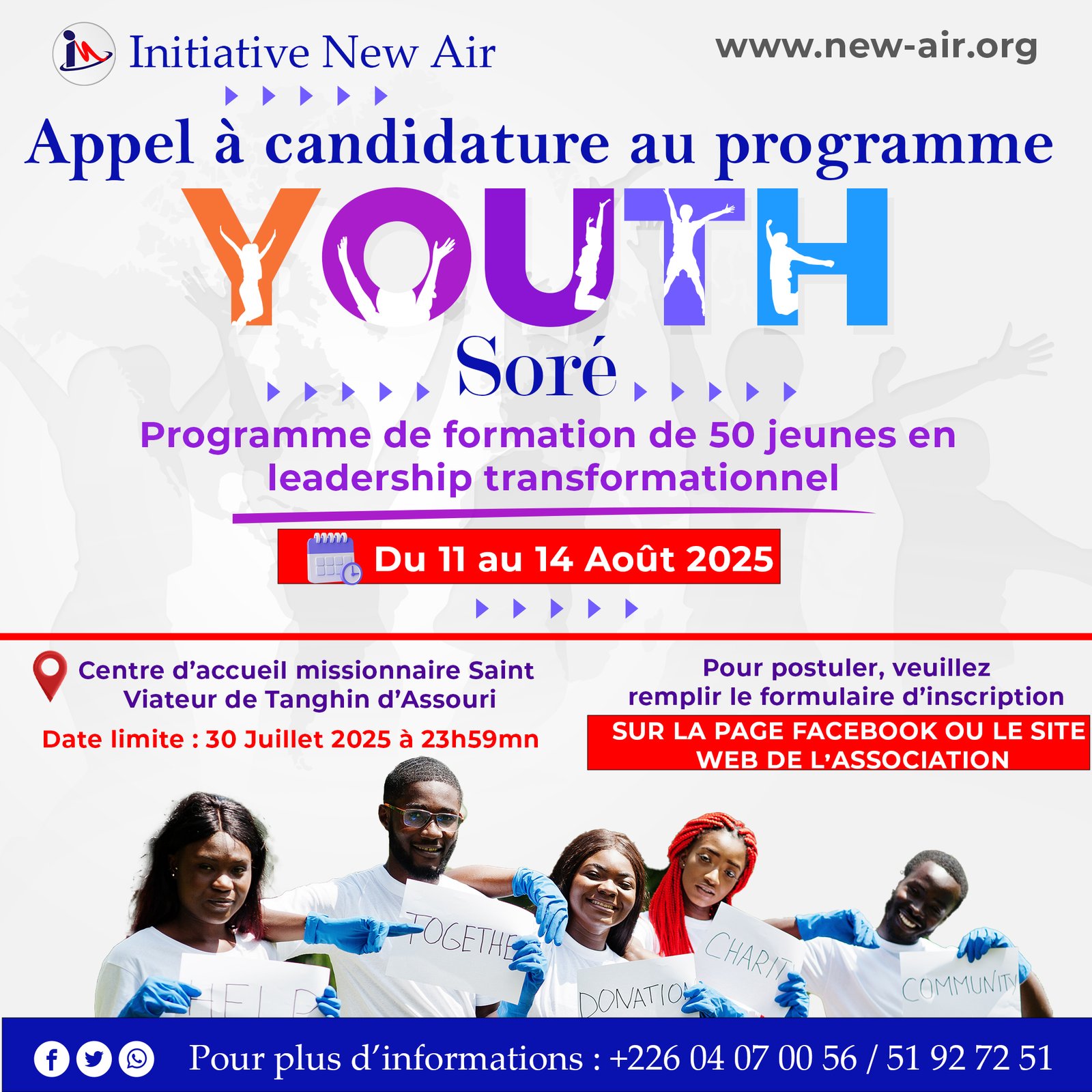 L’ Initiative New Air lance un appel à candidatures pour sélectionner 50 jeunes dans le cadre du programme #YOUTH_Soré, une formation en leadership transformationnel qui se tiendra du 11 au 14 août 2025.